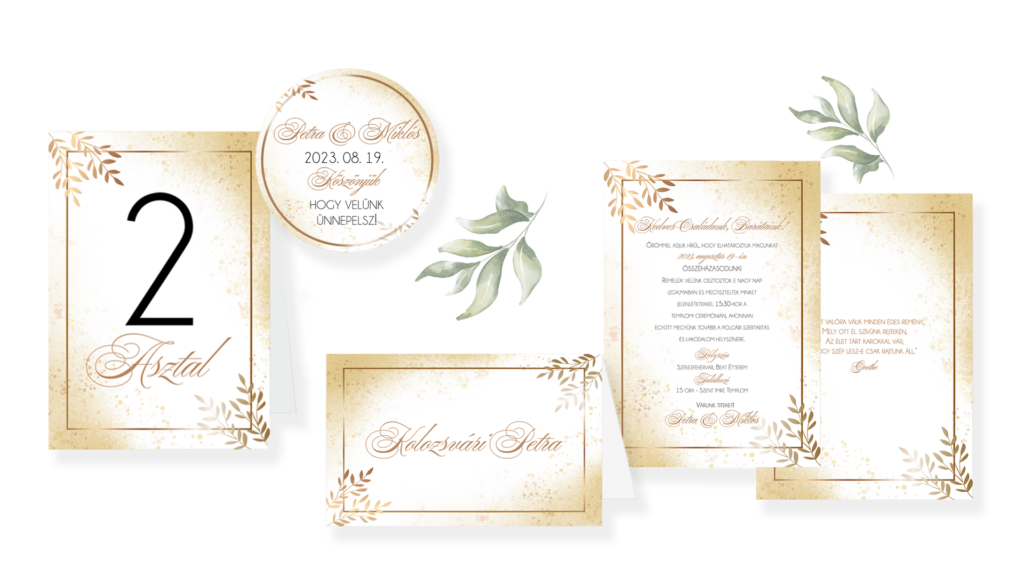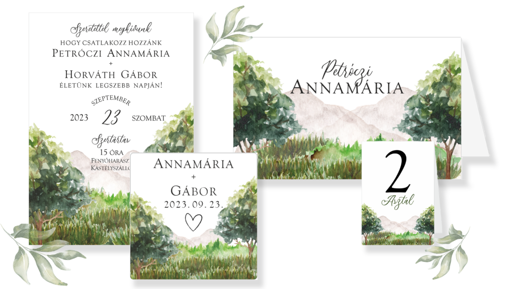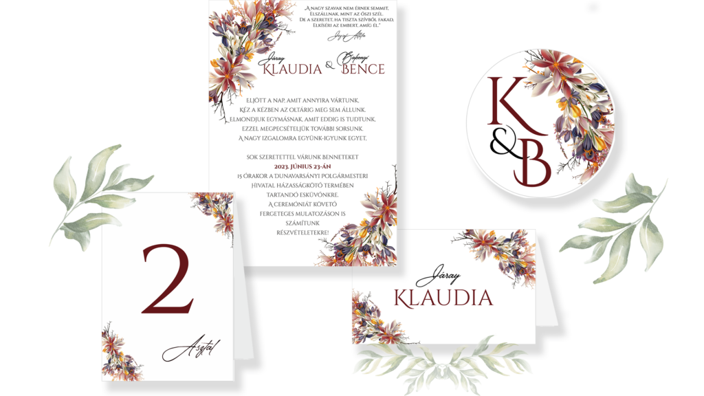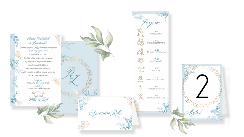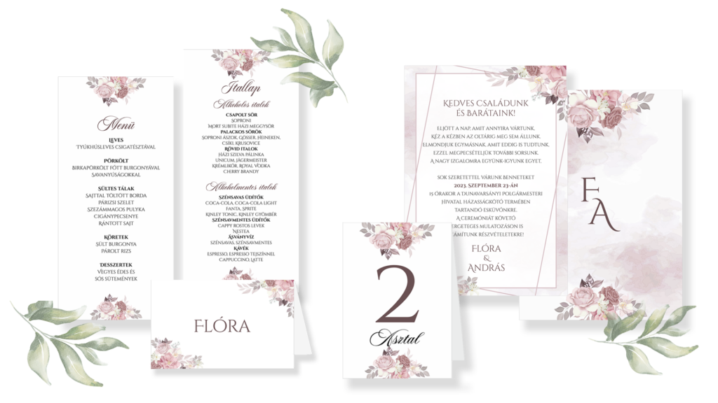 Az esküvői meghívó mellé azonos stílusban az összes esküvői kiegészítő is elkészül neked. Így tökéletesen harmonikus lesz a lakodalmad.