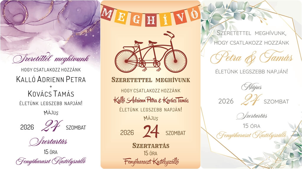A szerelmeteket tükröző stílus, a testre szabhatóság mind hozzájárulnak ahhoz, hogy olcsó, de stílusos meghívód készüljön a nagy napra. Ne hagyd, hogy a költségvetésed korlátozzon, hiszen segítségünkkel az olcsó esküvői meghívó is egyedi és emlékezetes lesz!